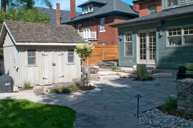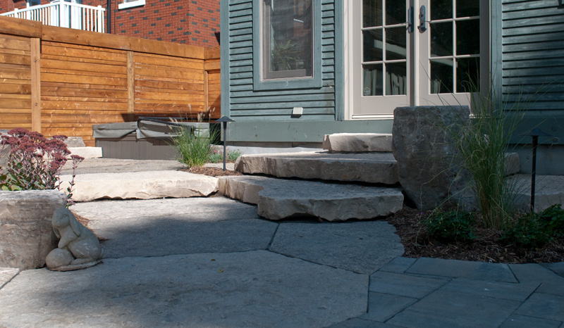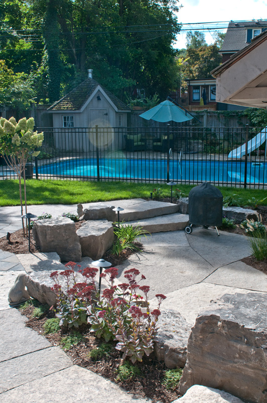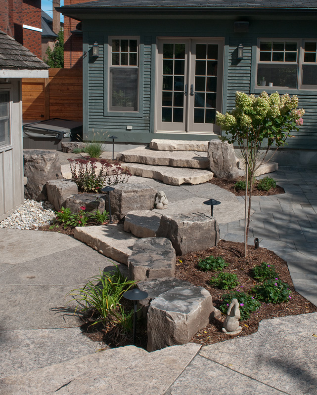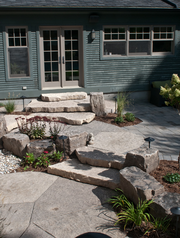 We replaced the tired old deck and expanded the patio for the whole family to enjoy. We created a natural stone patio, oversized flagstone steps, flowing interlocking patio, and vibrant gardens, complete with landscape lighting and irrigation.
